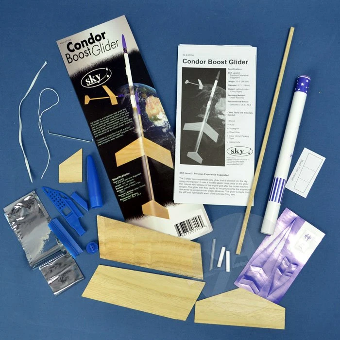 The Condor is a competition style glider that is boosted into the sky using rocket power. The glider then flies gently to the ground while the engine pod descends via streamer. The glider is made from the stiff, lightweight wood of the Chinese Tung tree.