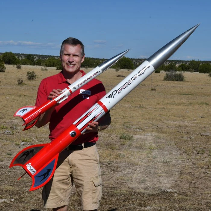 Stylish design, featuring curved fins, the Peregrine Jr is a 1/2-scale version of the widely popular Apogee kit. This one is easier to build, and can be flown on D size rocket motors.