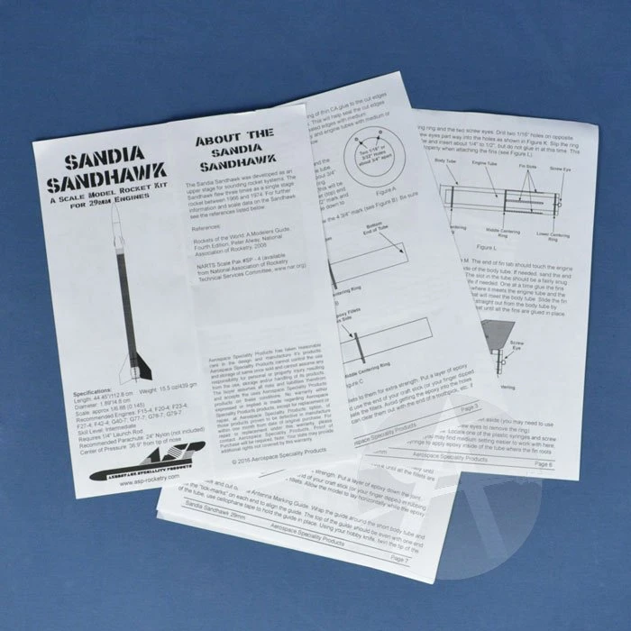 The 1/6.88 scale Sandia Sandhawk is built to withstand those high thrust mid-power motors. It features a 29mm motor mount, balsa nose cone, plywood fins, and a steel cable shock cord mount.