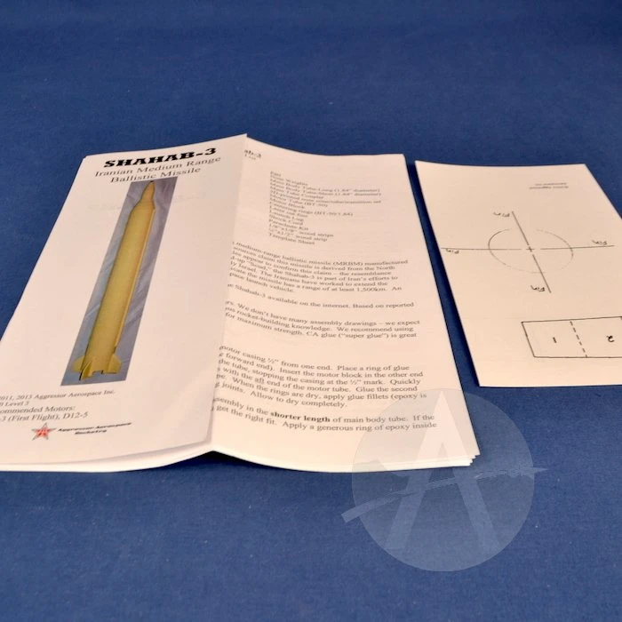 This 1/27th scale model of the SHAHAB-3 is similar to the old SCUD missile. This model rocket kit is simple to build and flies great on 24mm diameter motors.